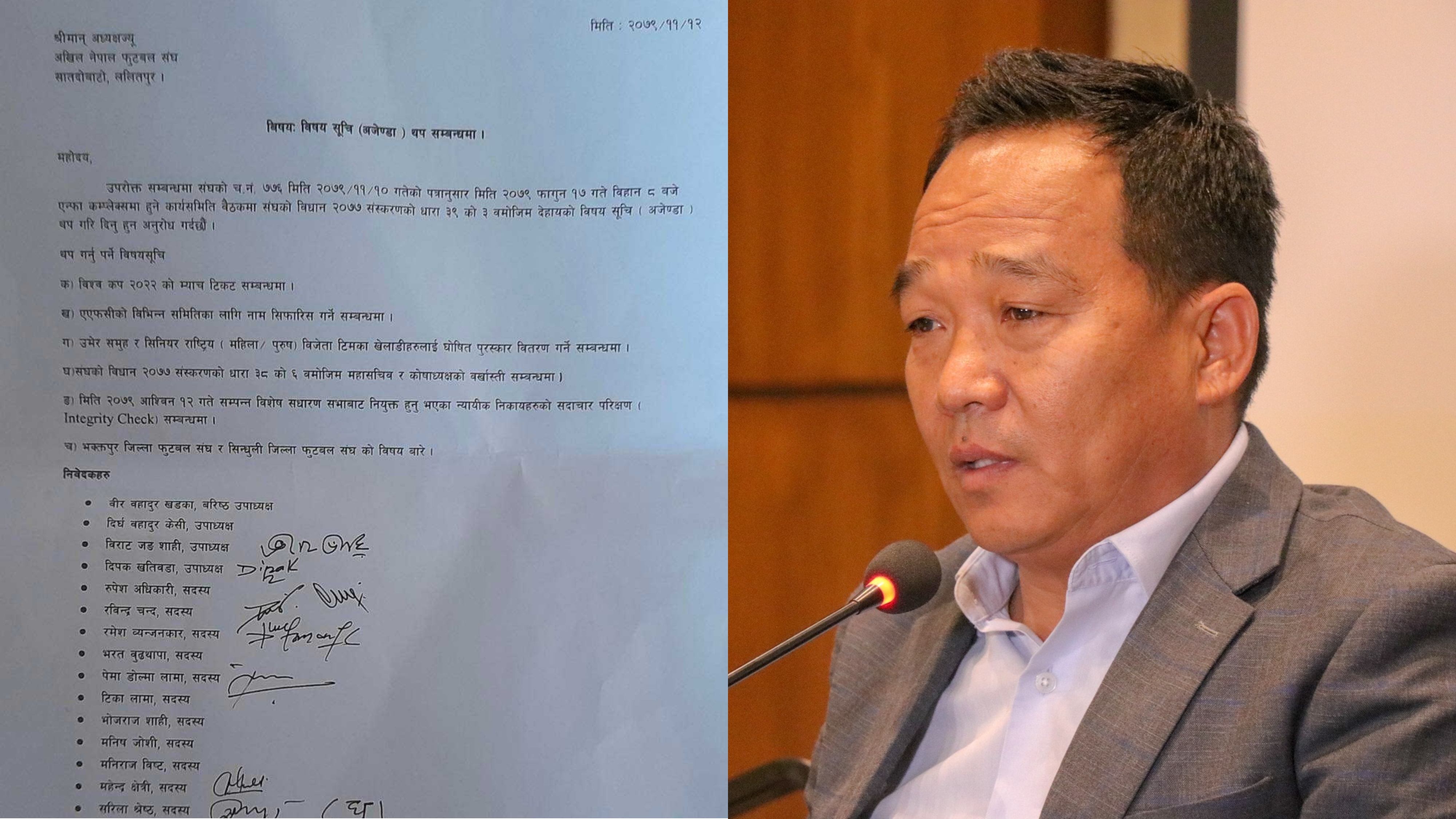 उपाध्यक्षहरू विराटजंग शाही, दीपक खतिवडा र दीर्घबहादुर केसी, कार्यसमिति सदस्यहरू रवीन्द्रबहादुर चन्द, महेन्द्र क्षेत्री, रुपेश अधिकारी, भोजराज शाही, भरत बुढाथापा, राम जोशी, रमेश व्यञ्जनकार, सरला श्रेष्ठ र पेमा लामाले एन्फा अध्यक्षलाई पत्र लेखेका हुन्। एन्फा केन्द्रीय कार्यसमिति बैठक बुधबार बस्दैछ।
