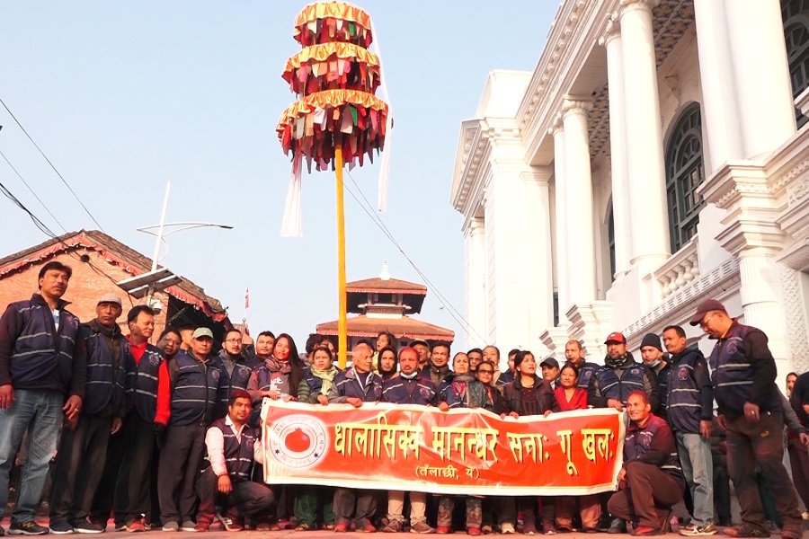 काठमाडौँ– काठमाडौँको वसन्तपुरस्थित हनुमानढोका दरबारमा तीनतले चीर ठड्याइएको छ।