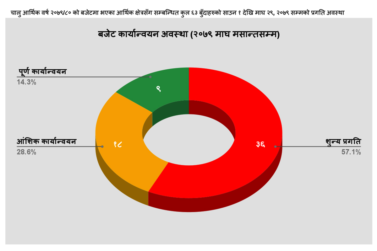 बजेटले अघि सारेका आर्थिक क्षेत्रसम्बन्धी ६३ बुँदामध्ये चालु आवको सात महिनामा ३६ बुँदाको प्रगति शून्य देखिएको छ।