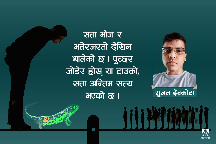 कतिसम्म भने यसअघि माओवादीको चर्को विरोध गर्ने दलहरू पनि अहिले सत्ताकै लागि उसैको नेतृत्वको सरकारमा मन्त्री खान लडाइँ गरिरहेका छन्। सत्ता भोज र भतेरजस्तो देखिन थालेको छ। पुच्छर जोडेर होस् या टाउको, सत्ता अन्तिम सत्य भएको छ। राजनीति केबल सत्ता र भागबन्डामा केन्द्रित भयो भन्दै 'त्यसलाई बदल्न' १० वर्षे युद्ध लडेर आएको माओवादीसमेत यसैमा चुर्लुम्मै डुब्नुले राजनीतिले बेथितिबाट पार पाउन अरू धेरै समय पर्खनु पर्ने देखिन्छ।