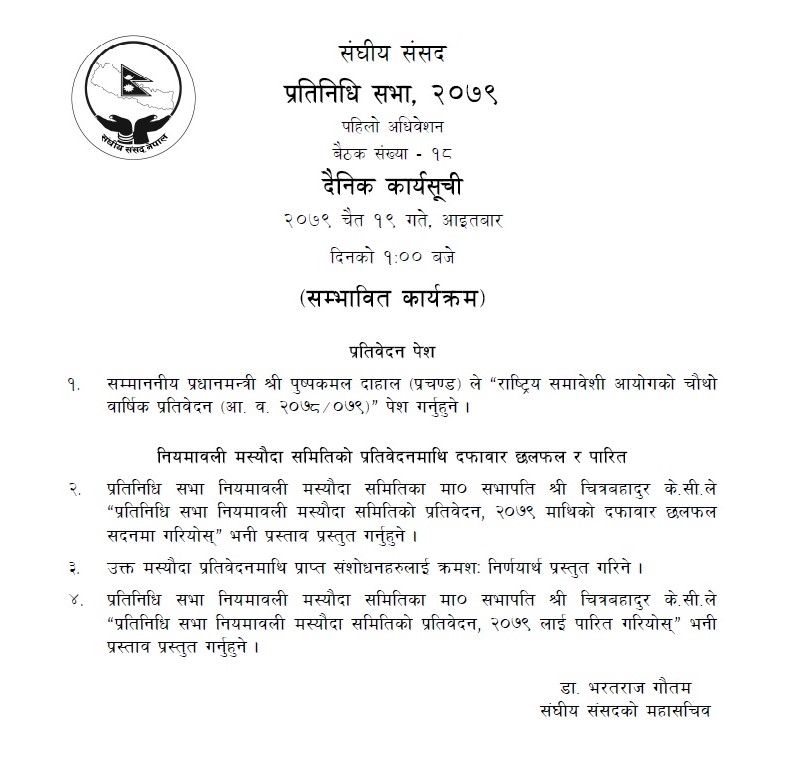 यस्तै, प्रधानमन्त्री पुष्पकमल दाहाल 'प्रचण्ड'ले राष्ट्रिय समावेशी आयोगको चौथो वार्षिक प्रतिवेदन पेस गर्ने कार्यसूचीसमेत रहेको संघीय संसद्का महासचिव डा भरतराज गौतमले जनाएका छन्।