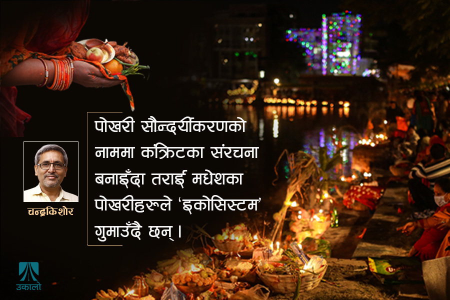 समाज अन्धदौडमा छ, उपभोक्तावादी मानसिकता हाबी भइरहेको छ। सौन्दर्यका परिभाषा फेरिएका छन्। पहिले हाम्रा समाजमा पोखरीको बीचमा जाँठ राखिन्थ्यो, पोखरीको विवाह गरिन्थ्यो। मान्छेहरू कुनै कीर्ति राख्नकै लागि पोखरी र इनार खन्न लगाउँथे। पोखरीहरू कुनै गोलाकार हुन्थे, कुनै ‘चौकोर’ हुन्थ्यो, कुनै षट्कोण आकारका हुन्थे। पोखरीका डिलहरू निर्माणको आफ्नै परम्परागत तरिका हुन्थे। पोखरीका अलग नामहरू हुन्थे। यी मान्यताहरूले गर्दा सामूहिकताको एउटा भाव थियो। हाम्रा पूर्वजले बनाएका त्यस्ता सार्वजनिक पोखरीहरू अचेल भूमाफियाहरूले अतिक्रमण गरिरहेका छन्। पोखरी पुरेर, माटो भरेर प्लटिङ गर्ने काम पो भइरहेको छ। अतिक्रमणकै कारण छठकै बेला पनि छठ–घाटहरूमा द्वन्द्व निम्तिने गरेको छ।