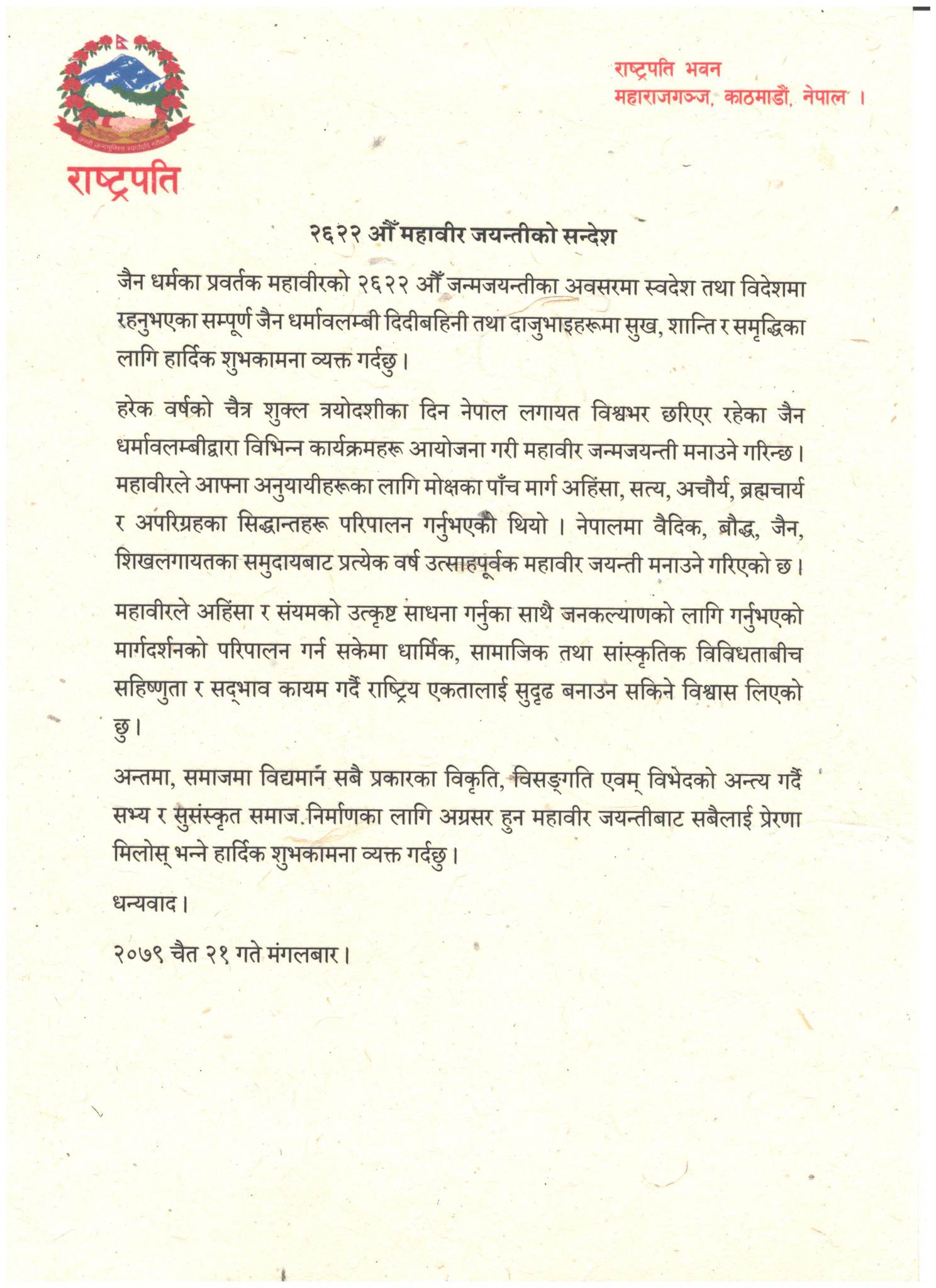 महावीरको २६२२औँ जन्मजयन्तीका अवसरमा मंगलबार शुभकामना दिँदै राष्ट्रपति पौडेलले महावीरले जनकल्याणका लागि गरेको मार्गदर्शन परिपालन गर्न सकेमा धार्मिक, सामाजिक तथा सांस्कृतिक विविधताबीच सहिष्णुता र सद्भाव कायम गर्दै राष्ट्रिय एकतालाई सुदृढ बनाउन सकिने विश्वास व्यक्त गरेका छन्।