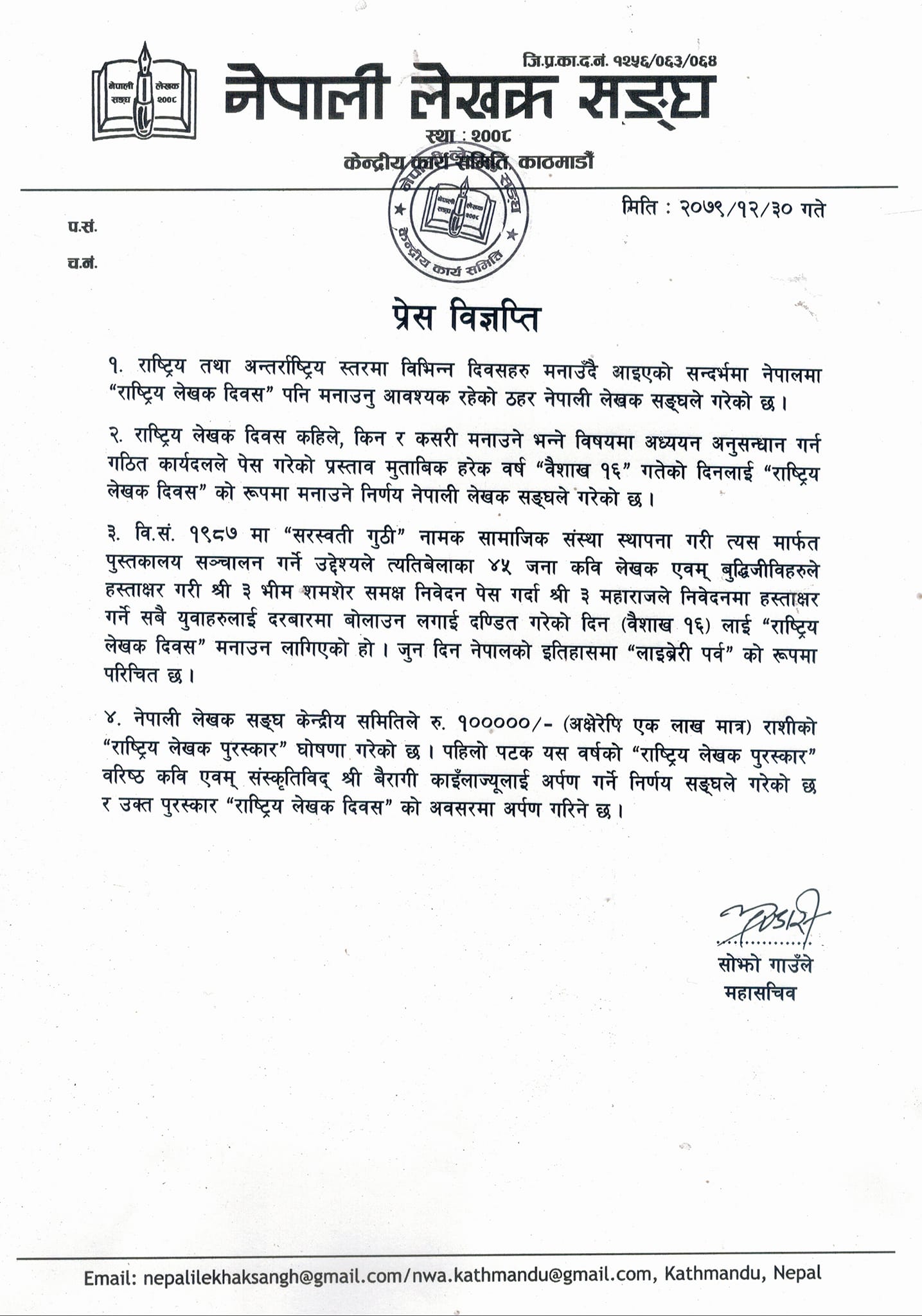 “राष्ट्रिय लेखक दिवस कहिले, किन र कसरी मनाउने भन्ने विषयमा अध्ययन अनुसन्धान गर्न गठित कार्यदलले गरेको प्रस्ताव मुताबिक हरेक वर्ष वैशाख गतेको दिनलाई राष्ट्रिय लेखक दिवसका रूपमा मनाउने निर्णय लेखक संघले गरेको छ,” जारी विज्ञप्तिमा भनिएको छ।