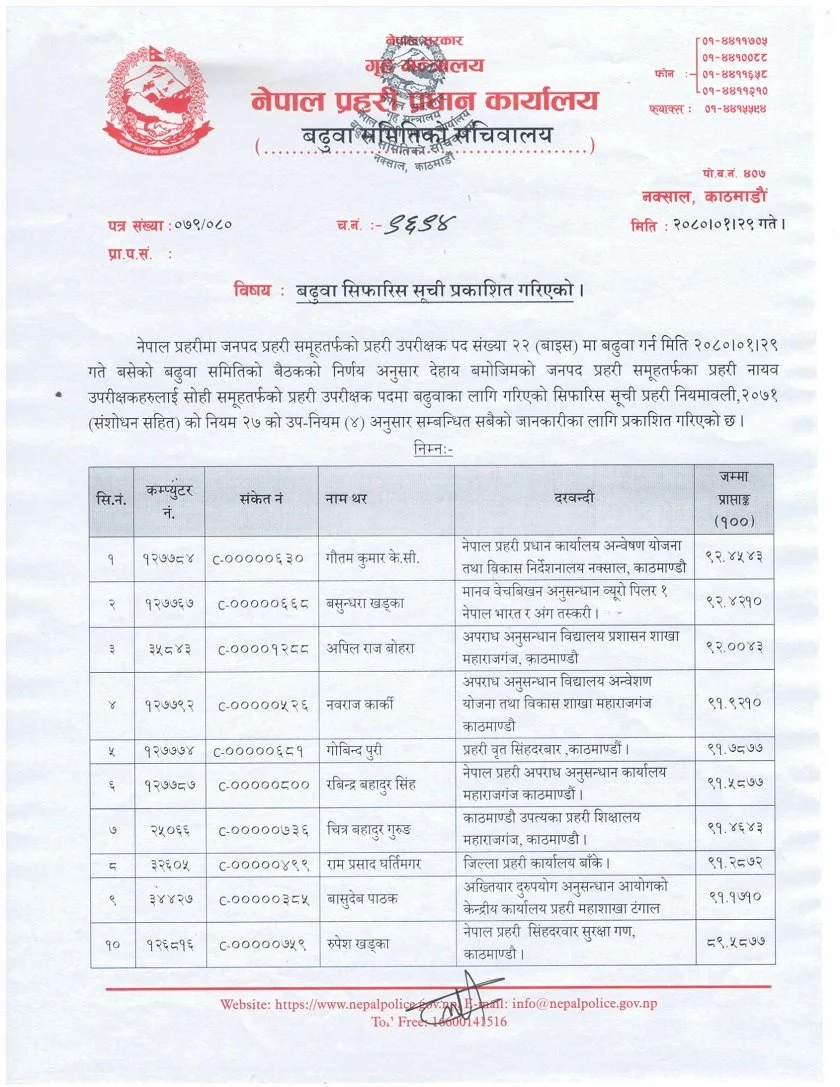 शुक्रबार बसेको बढुवा समितिको बैठकले बढुवाका लागि सिफारिस गरेको हो। सिफारिस सूचिअनुसार डीएसपी गौतम कुमार केसी पहिलो नम्बरमा परेका छन्।