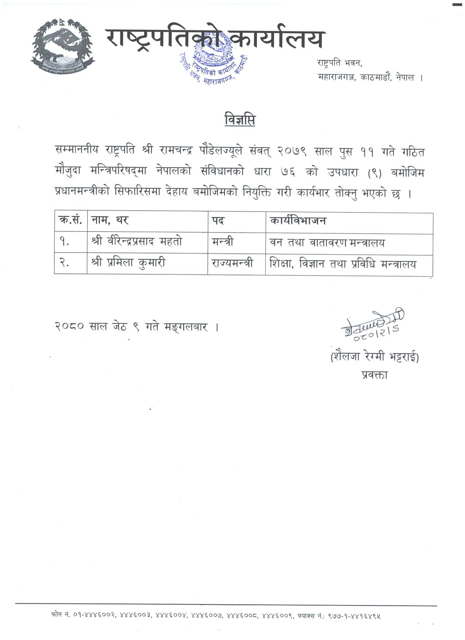 प्रधानमन्त्रीको सिफारिसमा राष्ट्रपति रामचन्द्र पौडेलले जसपाका वीरेन्द्रकुमार महतोलाई वनमन्त्री र प्रमिला कुमारीलाई शिक्षा राज्यमन्त्री नियुक्त गरेका छन्।