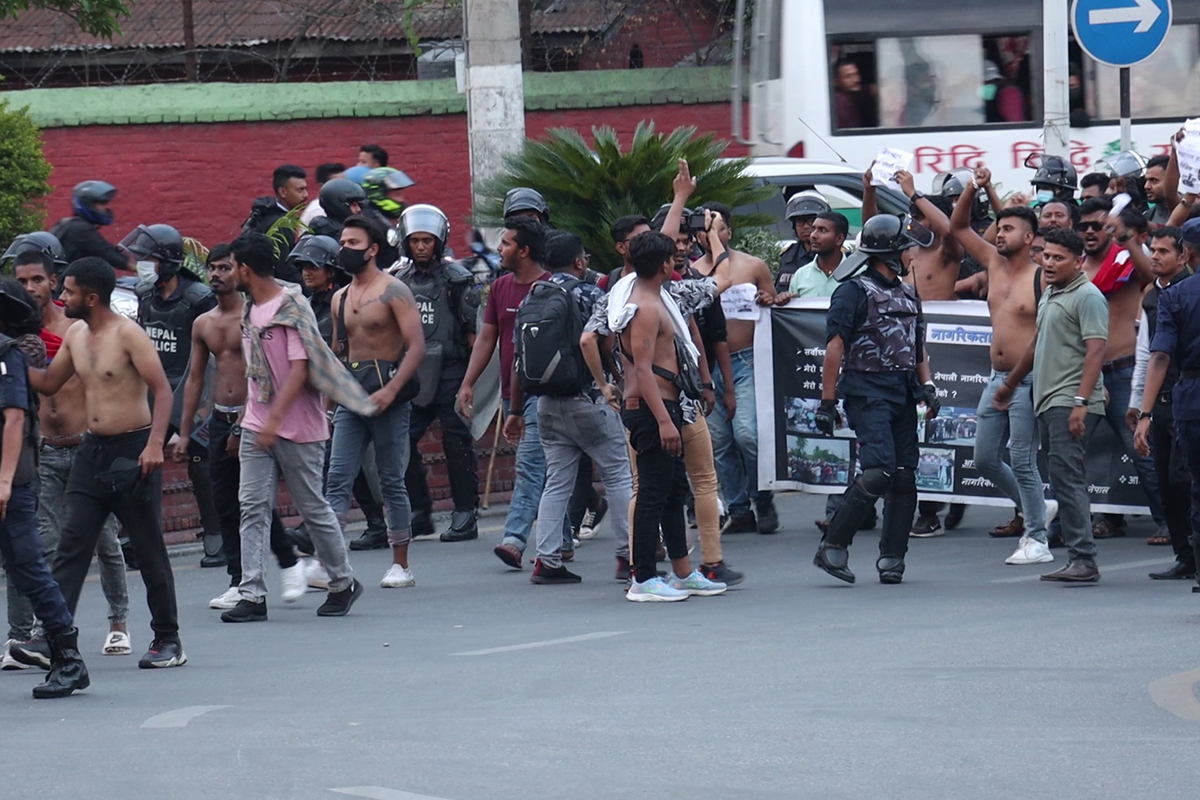 सोही क्रममा युवकले आफैँलाई पेट्रोल खन्याएर आगो लगाएका हुन्। प्रहरीले उनलाई उद्धार गरेर ट्रमा सेन्टर लगेको छ। उनी मोरङ कटहरीका नीरजकुमार कामत रहेको बताइएको छ। उनी नागरिकताविहीन संघर्ष समितिका सदस्यसमेत हुन्।