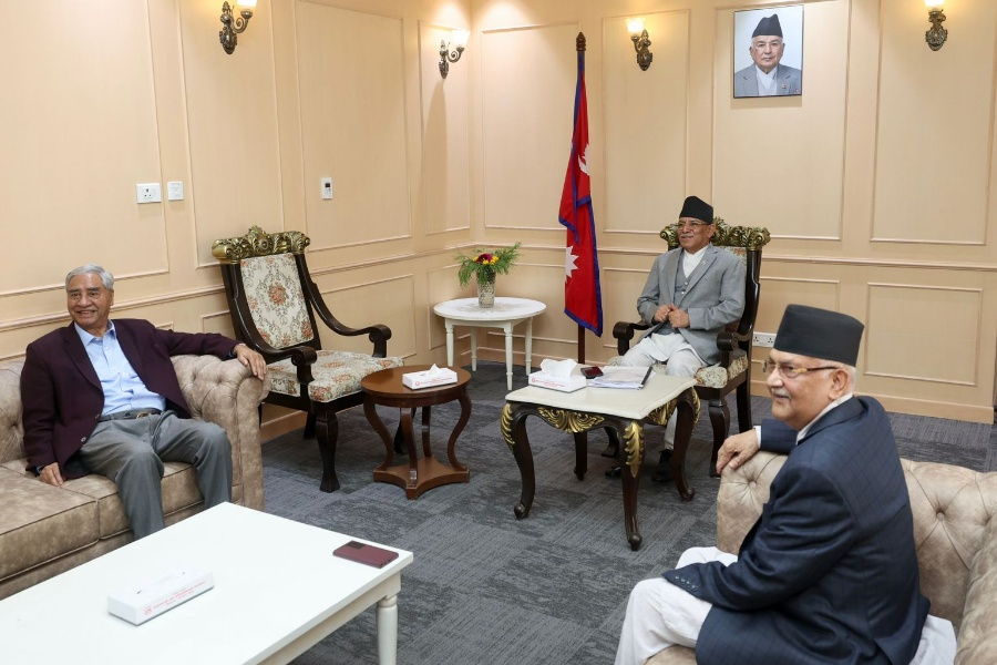 प्रधानमन्त्री पुष्पकमल दाहाल ‘प्रचण्ड’, कांग्रेस सभापति शेरबहादुर देउवा र एमाले अध्यक्ष केपीशर्मा ओलीबीच सिंहदरबारमा छलफल भइरहेको छ।