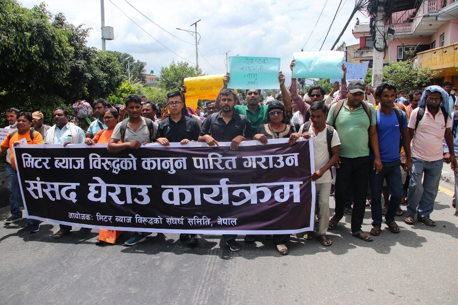 काठमाडौँ– मिटरब्याज विरुद्धको कानून पारित गर्न माग गर्दै मिटरब्याज पीडितहरूले काठमाडौँमा प्रदर्शन गरेका छन्। आइतबार काठमाडौँको माइतीघर मण्डलदेखि नयाँ बानेश्वरसम्म मिटरब्याज पीडितहरूले प्रदर्शन गरेका हुन्।