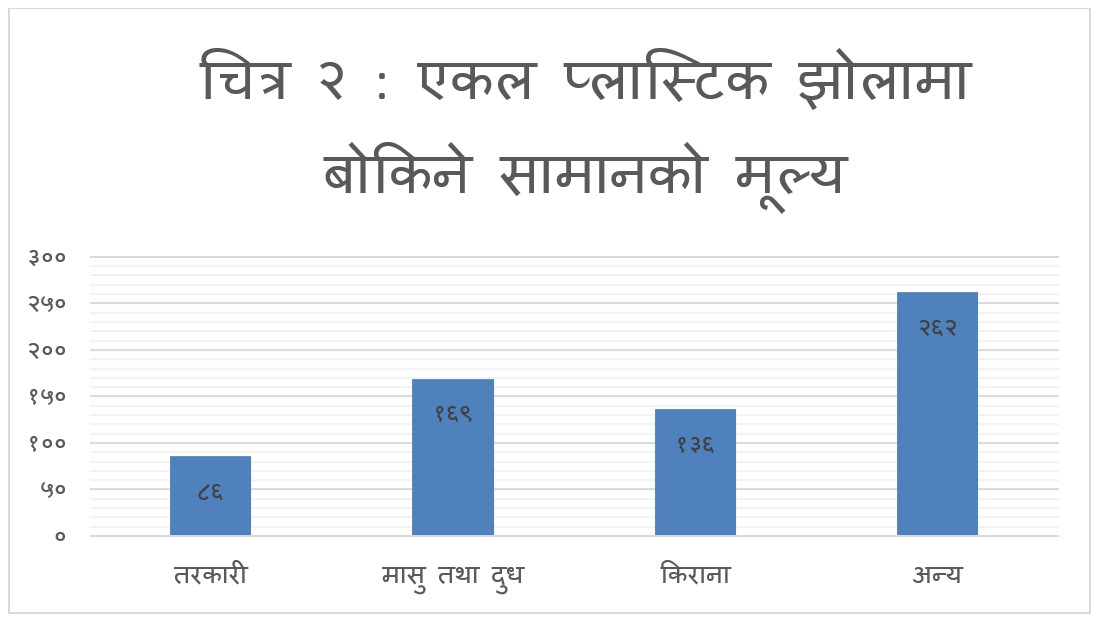 उक्त अध्ययनले १३७ रुपैयाँको सामान बोक्न एउटा प्लास्टिकको झोला प्रयोग हुने गरेको देखिन्छ। ८६ रुपैयाँको तरकारी बोक्न एक प्लास्टिक झोला प्रयोग हुने देखिन्छ भने १६९ को दूध तथा मासु बोक्न एक प्लास्टिकको झोला प्रयोग हुने देखिन्छ।