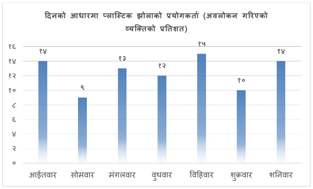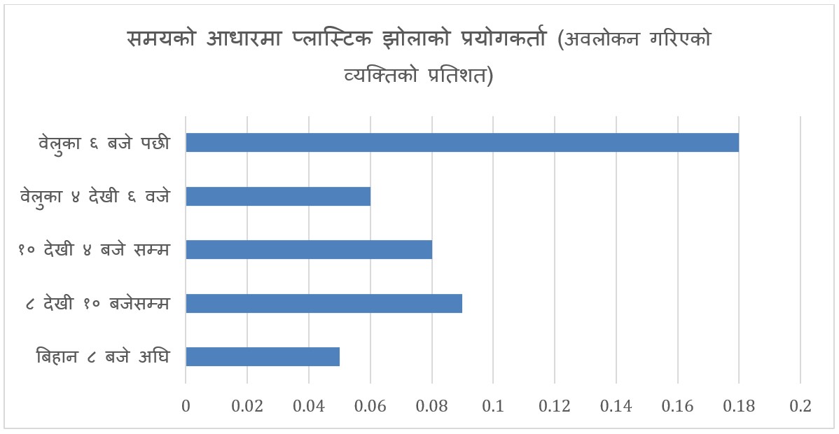 करिब ३६ हजार जनाभन्दा बढी व्यक्तिको प्लास्टिक झोला प्रयोगको विश्लेक्षणअनुसार साइकल वा मोटरसाइकलमा हिँड्नेभन्दा बाटोमा हिँड्नेले प्लास्टिक झोला बोक्ने सम्भावना अधिक हुने देखाउँछ। साथै पुरुष र युवाले प्लास्टिकको झोला कम बोक्ने गरेको देखिन्छ। कार्यालय र मनोरञ्जन क्षेत्र जस्तै; पार्कभन्दा घरबस्ती भएको क्षेत्रमा अनि गल्लीभन्दा मूलबाटोमा हिँड्नेले प्लास्टिकको झोला बोक्ने सम्भावना धेरै रहेको पाइन्छ। चित्रमा देखाएजस्तै सर्वसाधारणले बिहीबार, आइतबार अनि शनिबार प्लास्टिकको झोला बोक्ने सम्भावना धेरै हुन्छ भने, बेलुकाको समयमा प्लास्टिकको प्रयोग बढ्ने देखिन्छ। यो समय मानिसहरू बाहिर निस्कने, किराना सामान तथा तरकारी किन्ने समय पनि हो।