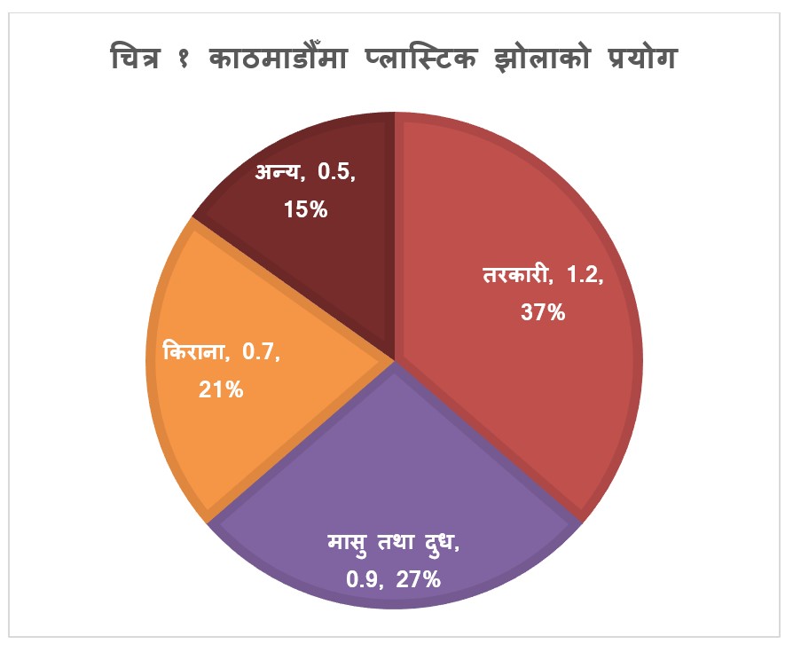 २०७० सालमा हामीले काठमाडौँ उपत्यकाका २५८ घरपरिवारको १४ दिनको प्लास्टिक झोला प्रयोगबारे अध्ययन गरेका थियौँ। अध्ययनले प्रतिव्यक्ति दैनिक ०.८६ वटा र प्रतिघरपरिवार ३.३ वटा प्लास्टिकको झोला प्रयोग गर्ने पाइएको थियो। दैनिक प्रयोग हुनेमध्ये ३५ प्रतिशत तरकारी बोक्न, किराना सामानका लागि २६ प्रतिशत र दूध तथा मासु बोक्न २० प्रतिशतले प्लास्टिक झोला प्रयोग गर्ने गरेको भेटिएको थियो।
