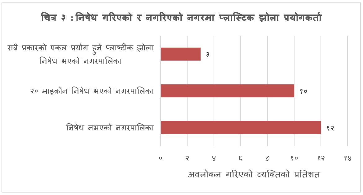 हामीले २०७०/७१ सालमा २३ नगर (काठमाडौँ उपत्यकासमेत गरी) का करिब ३६ हजार जनाभन्दा बढी व्यक्तिले कस्तो झोला बोक्दा रहेछन् भनेर अवलोकन गरी तथ्यांक संकलन गरेका थियौँ। उक्त अवलोकनबाट संकलित तथ्यांकको विश्लेषणको संक्षिप्त नतिजा चित्र ३ मा दिइएको छ। यस चित्रले पनि सबै प्रकारको प्लास्टिक झोला निषेध भएको क्षेत्रमा ३ प्रतिशत व्यक्तिले प्लास्टिक झोला प्रयोग गरेको पाइएको थियो भने २० माइक्रोनसम्मको प्लास्टिक झोला निषेध भएकोमा १० प्रतिशत र निषेध नभएको क्षेत्रमा १२ प्रतिशतले प्लास्टिक झोला प्रयोग गरेको पाइएको थियो।