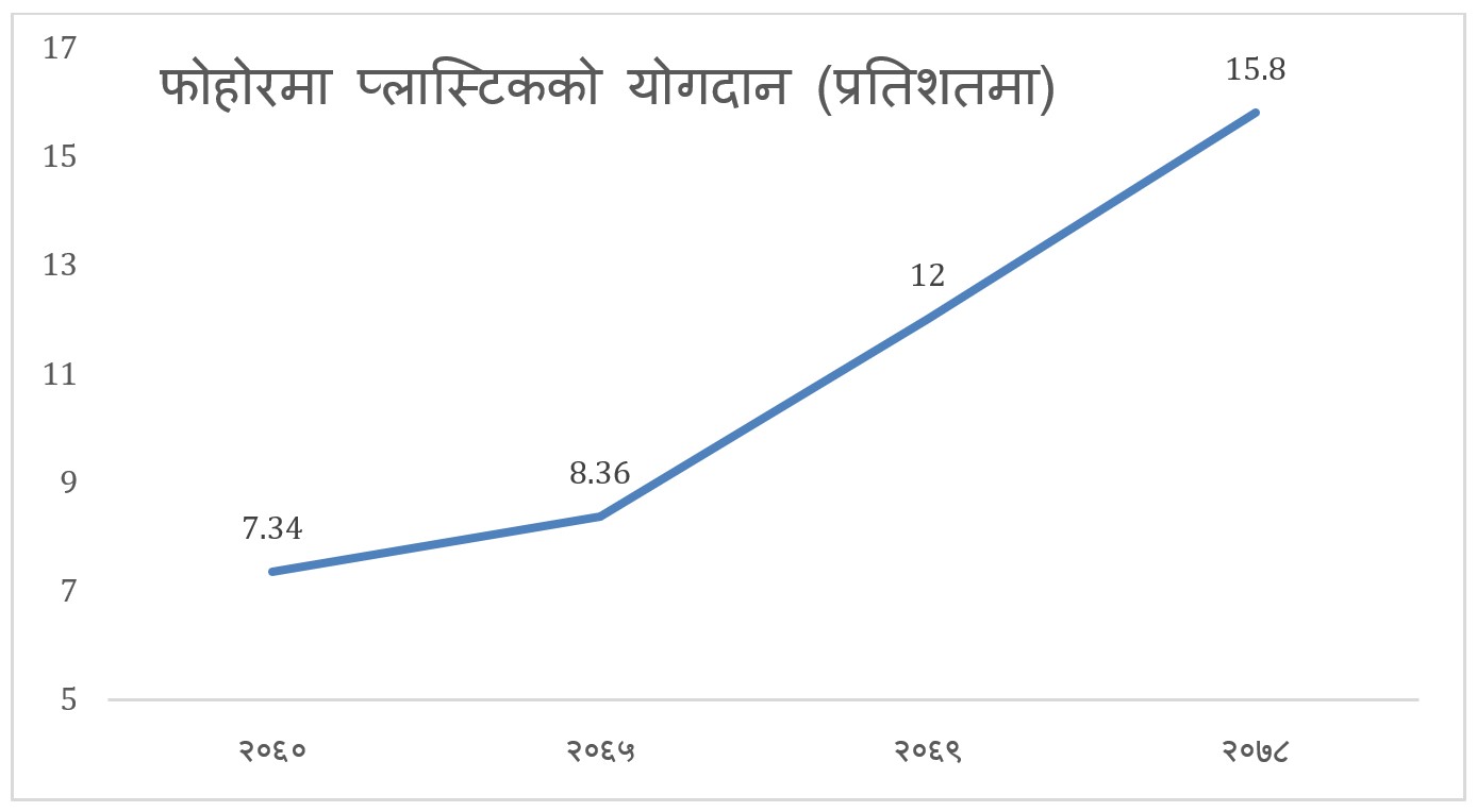 फोहोरमैलामा प्लास्टिकको योगदानले पनि यसको बढ्दो प्रयोगलाई पुष्टि गर्छ। २०६० सालको सर्वेक्षणअनुसार फोहोरमा करिब सात प्रतिशत प्लास्टिकजन्य वस्तु मिसिएका थिए। दुई दशकमा यो प्रतिशत दुई गुणाले भएको छ। २०७८ को सर्वेक्षणअनुसार वार्षिक सरदर प्रतिनगरपालिका दुई हजार २३२ टन फोहोर संकलन हुने गरेकोमा ३५२ टन अर्थात् १६ प्रतिशतको हाराहारी प्लास्टिकजन्य पदार्थ रहेको देखिन्छ।