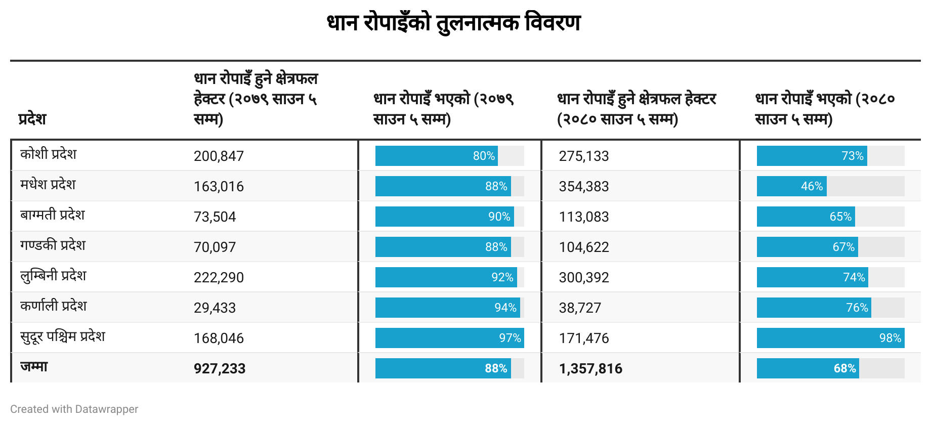 कृषि विभागबाट प्रदेशसँगको समन्वयमा तयार पारिएको विवरणअनुसार सातै प्रदेशमध्ये मधेश प्रदेशमा सबैभन्दा कम क्षेत्रफलमा रोपाइँ भएको छ। त्यहाँ ३ लाख ५४ हजार ३ सय ८३ हेक्टर रोपाइँ हुने क्षेत्रफलमध्ये हालसम्म जम्मा १ लाख ६३ हजार १६ हेक्टरमा मात्र किसानले धान रोपेका छन्। यस्तै, बाग्मती प्रदेशमा रोपाइँ हुने कुल क्षेत्रफलको ६५ प्रतिशत अर्थात् ७३ हजार ५ सय ४ हेक्टरमा मात्र रोपाइँ भएको मन्त्रालयको तथ्यांक छ।