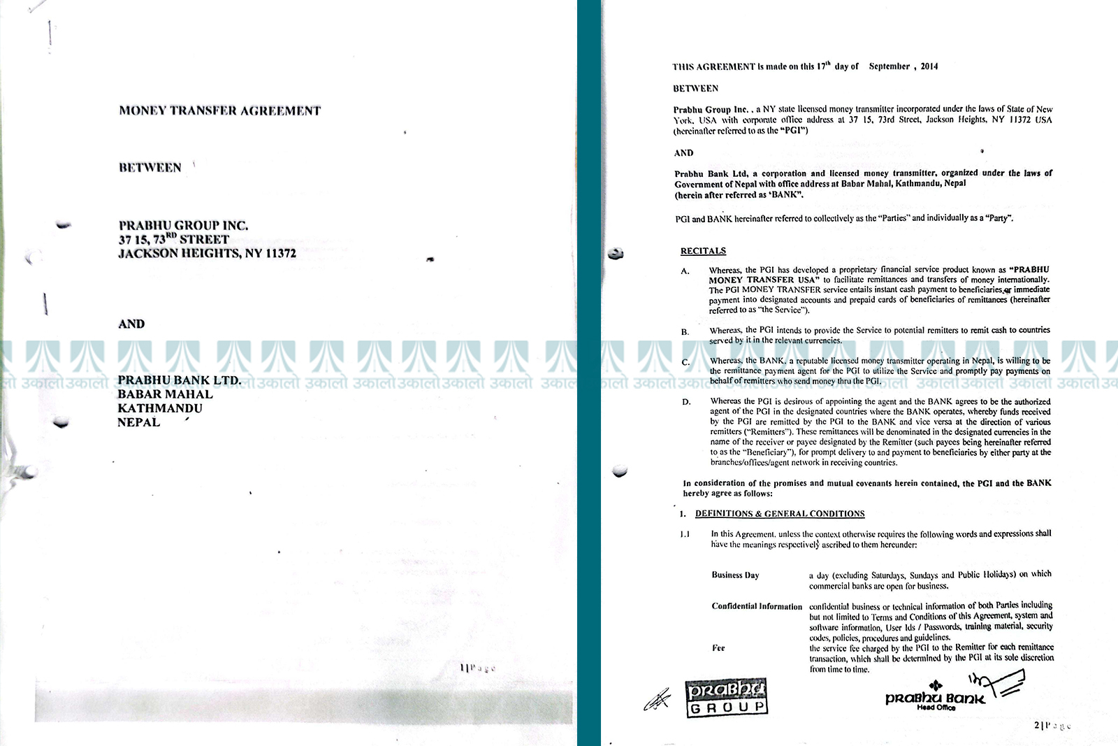 सम्झौतामा प्रभु बैंकलाई प्रभु यूएसएको एजेन्टको रूपमा काम गर्ने व्यवस्था गरिएको छ। रेमिट्यान्स कारोबारका क्रममा अग्रिम भुक्तानी (प्रि फन्डिङ) वा बैंक ग्यारेन्टीको प्रावधान सम्झौतामा समावेश गरिएको छैन। त्यसबेला राष्ट्र बैंकले यस्तो प्रावधान अनिवार्य गरेको थिएन। तर त्यसबेला नै रेमिट्यान्स कारोबार विवादास्पद बन्नथालेका र विदेशी मुद्रा अपचलनका घटना सार्वजनिक भइरहेका थिए।