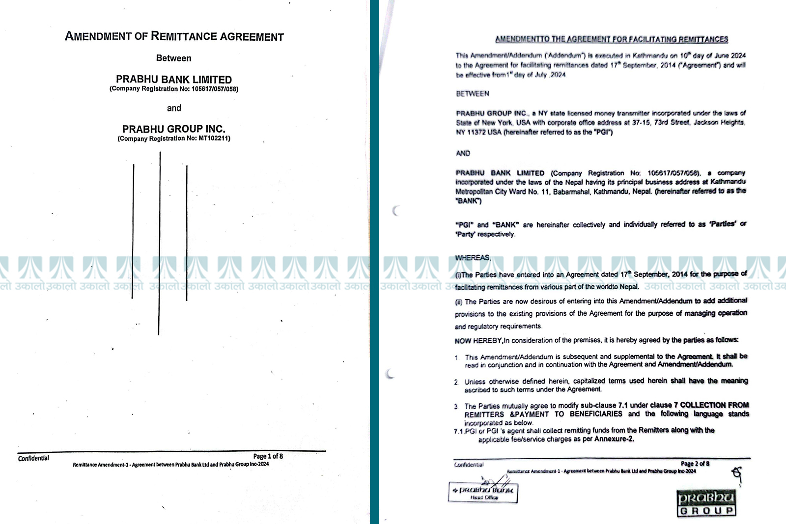 हामीलाई प्राप्त संशोधित सम्झौतामा ‘रेमिट्यान्स कारोबारमा कम्पनीले प्रि–फन्ड व्यवस्था गर्नुपर्ने वा त्यसको सट्टा बैंक ग्यारेन्टी प्रदान गर्नुपर्ने’ प्रावधान समावेश छ जसमा प्रभु बैंकबाट सीईओ अशोक शेरचन र प्रभु यूएसएका सीईओ सुजाता शाक्य ताम्राकारले हस्ताक्षर गरेका छन्। संशोधित सम्झौताको धारा ८.१ मा उल्लेख छ, “प्रि–फन्ड उपलब्ध नभएमा बैंकले बैंक ग्यारेन्टीसमेत स्वीकार गर्न सक्नेछ।”