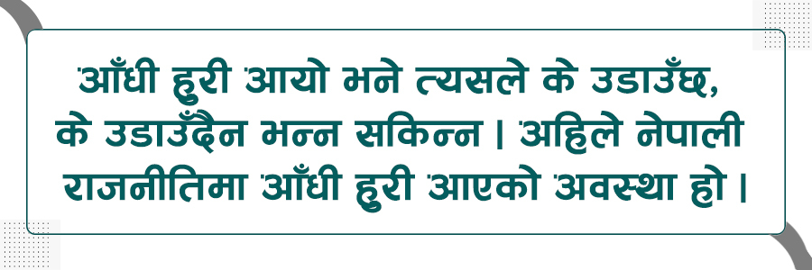 आँधी हुरी आयो भने त्यसले के उडाउँछ, के उडाउँदैन भन्न सकिन्न। अहिले नेपाली राजनीतिमा आँधी हुरी आएको अवस्था हो। काठमाडौँमा जसरी बालेन शाहजीका पक्षमा आँधी आयो, उपनिर्वाचनमा पनि त्यही आँधीबेहरी दोहोरिएको हो। त्यस कारण यसलाई 'जनरलाइज' गरेर पार्टीहरूको मूल्यांकन गर्न मिल्छजस्तो लाग्दैन। तर पार्टीहरू परिवर्तन भएनन् भने त्यो आँधी हुरी निरन्तर जारी रहन्छ।