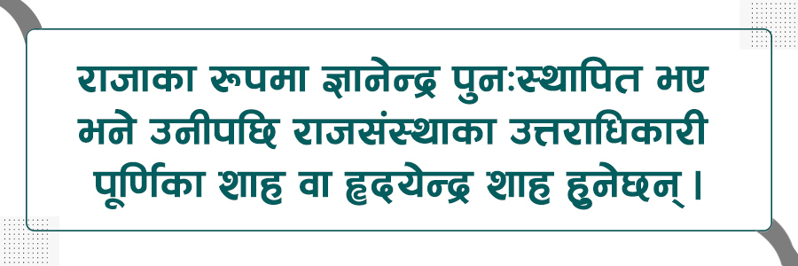 मानौँ, तपाईंहरू राजसंस्था फर्काउन सफल हुनुभयो। ज्ञानेन्द्र रहुन्जेल त उनै राजा होलान्, त्यसपछि चाहिँ राजाको उम्मेदवार को?