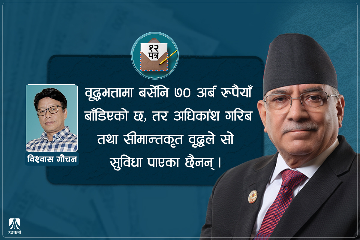दुःखको कुरा, तपाईंहरू भने झन् संकुचित राजनीतिक लाभका लागि वृद्धभत्ताजस्तो अत्यन्तै प्रतिगामी स्रोत वितरण प्रणालीको श्रेय लिन एकअर्का दलबीच विवेकहीन प्रतिस्पर्धामा हुनुहुन्छ। जनताबाट ३९ प्रतिशतसम्म कर निचोरेर धनी र मध्यम वर्ग लाभान्वित हुने गरी बर्सेनि बेफिक्र ७० अर्ब रुपैयाँ बाँड्नु भएको छ, जबकि यो समूहले विगतमा सायदै राज्यलाई कहिले कर तिरेको होस्। अधिकांश गरिब तथा सीमान्तकृत वृद्धले भने सो सुविधा पाएका छैनन्। नयाँ संविधानपछि बाँडिएको वृद्धभत्ता कृषि क्षेत्रमा लगानी गरेको भए मुलुक आज कृषिमा पूर्णरूपले आत्मनिर्भर हुने थियो।