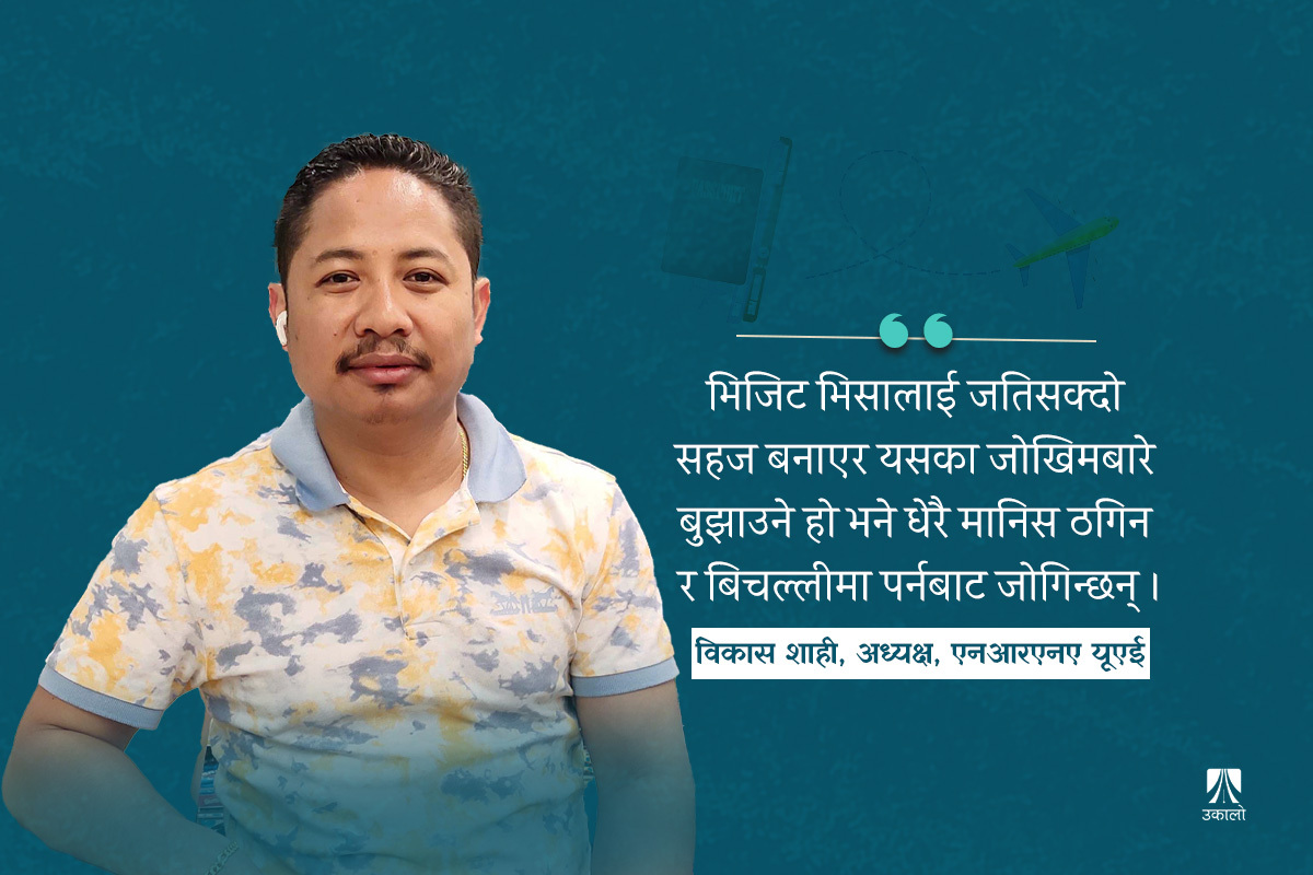 गैरआवासीय नेपाली संघ (एनआरएनए) यूएईका एनसीसी अध्यक्ष विकास शाही भिजिट भिसामा यूएई पुग्नेमध्ये बढीमा ५ प्रतिशत मात्र घुम्न जानेहरू भएको बताउँछन्। “भिजिट भिसामा आउने अधिकांश कामकै लागि आउँछन्, कैयौँ त अरू देश जानलाई यहाँ आउँछन्। पहिले पहिले त्यसरी आउनेले काम पनि पाए, अहिले भिजिट भिसामा आउनेलाई काम पाउन सजिलो छैन,” उनले भने, “यूएईले भिजिट भिसा जारी गरिदिने हुँदा नेपाल सरकारले रोकेर साध्य हुन्न। कडाइ मात्र गर्दा त्यसरी जानेहरू दलाललाई धेरै पैसा तिर्न बाध्य भइरहेका छन्। बरु भिजिट भिसालाई जतिसक्दो सहज बनाउने र यसका जोखिमबारे बुझाउने हो भने धेरै मानिस ठगिन र बिचल्लीमा पर्नबाट जोगिनेछन्।”