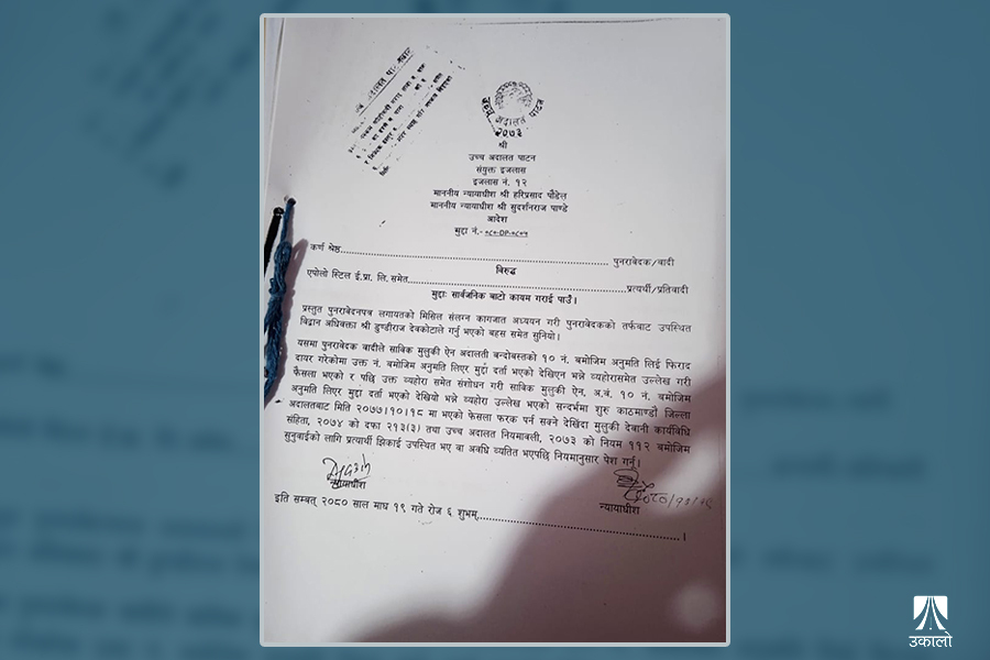 “शुरू काठमाडौँ जिल्ला अदालतबाट मिति २०७७/१०/१८ मा भएको फैसला फरक पर्न सक्ने देखिँदा मुलुकी देवानी कार्यविधि संहिता, २०७४ को दफा २१३ (३) तथा उच्च अदालत नियमावली, २०७३ को नियम ११२ बमोजिम सुनुवाइका लागि प्रत्यर्थी झिकाइ उपस्थित भए वा अवधि व्यतीत भएपछि नियमानुसार पेस गर्नू,” उच्च अदालत पाटनको आदेशमा भनिएको छ।