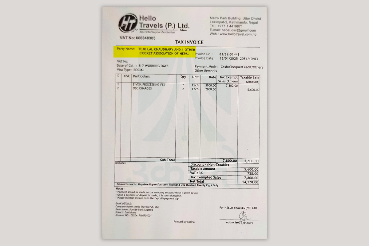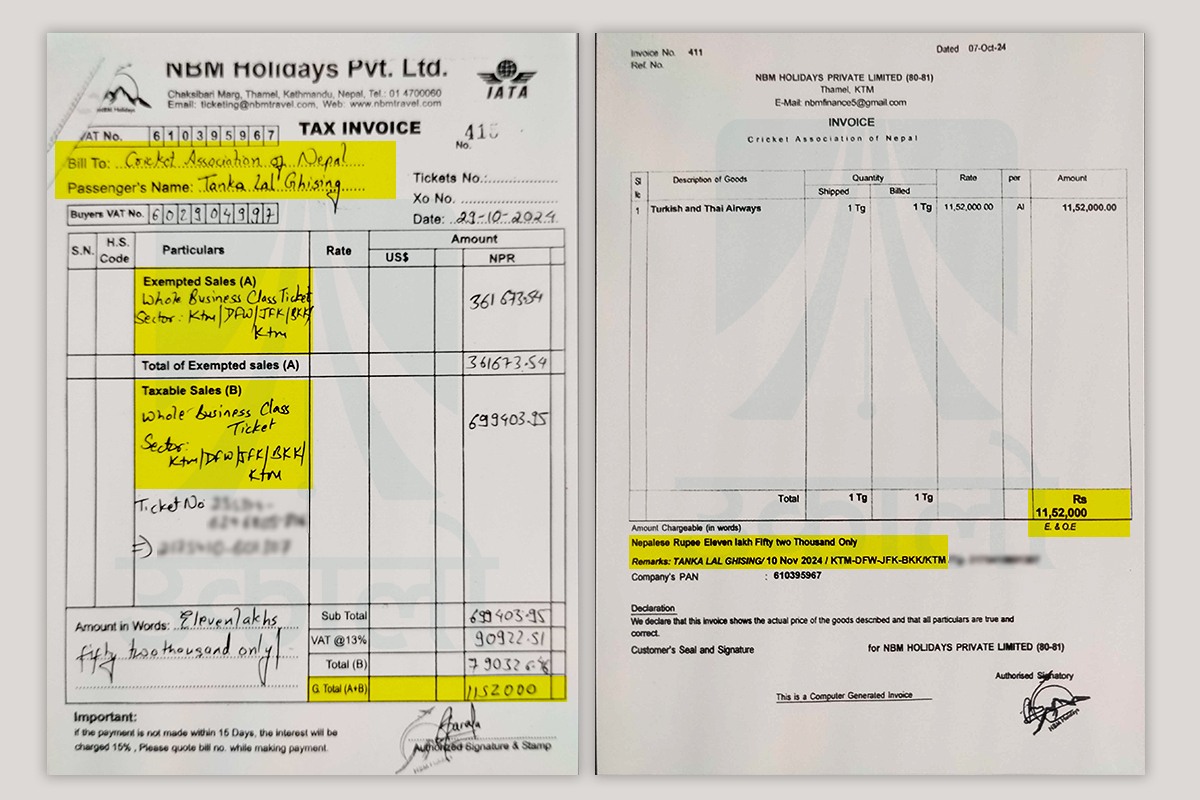 ठिक त्यही बेला राखेप सदस्य अञ्जन धमला पनि क्यानकै ‘स्पोन्सर्ड ट्रिप’मा अमेरिका गएका थिए, (पछि एनपीएलमा भएको अनियमितता छानबिन गर्न बनेको कार्यदलमा धमला नै संयोजक बनाइए।) उनी सन् २०२४ अक्टोबर २१ देखि २५ सम्म अमेरिकाको डालसस्थित ‘ले मेरिडेन डालस बाई द ग्यालेरिया’ होटेलमा बसेको सोही होटेलले जारी गरेको इन्भोइसमा देखिन्छ। उनको परिचयमा भने ‘यूएस क्रिकेट स्टाफ’ लेखिएको छ।