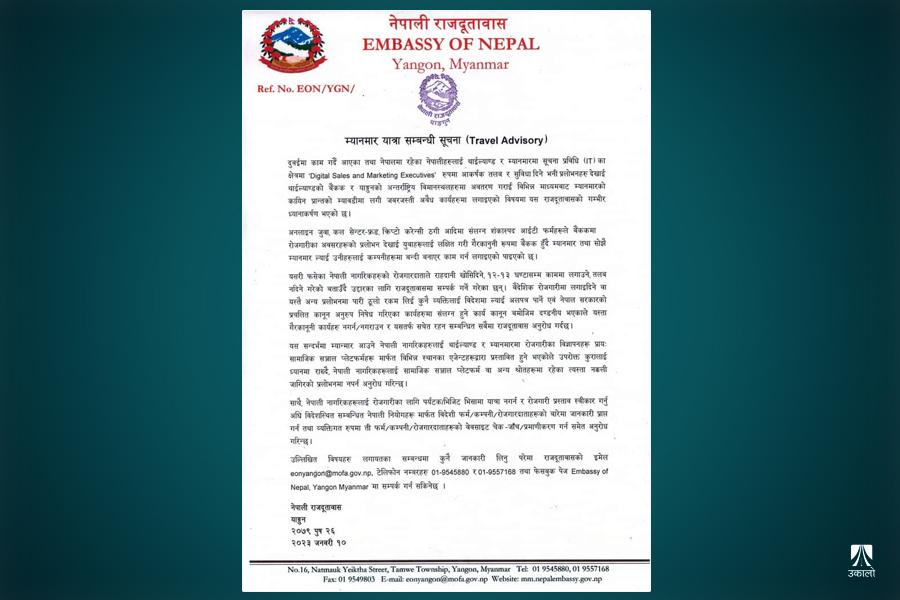 रंगुनस्थित नेपाली राजदूतावासले गत जनवरी १० मा अनलाइन जुवा, कल सेन्टर फ्रड, क्रिप्टोकरेन्सी ठगी आदिमा संलग्न आईटी कम्पनीहरूले रोजगारीको प्रलोभन देखाई गैरकानूनी रूपमा बैंकक, दुबई लगायतका क्षेत्रमा कार्यरत नेपाली युवायुवतीलाई लक्षित गरी म्यान्मार ल्याएर उनीहरूलाई बन्दी बनाई काममा लगाएको पुष्टि गर्दै ‘ट्राभल एड्भाइजरी’ नै जारी गरेको छ। दूतावासले सामाजिक सञ्जाल वा अन्य स्रोतहरूमा आउने त्यस्ता नक्कली जागिरको प्रलोभनमा नपर्न र पर्यटक भिसामा यात्रा नगर्न सचेत गराएको छ।
