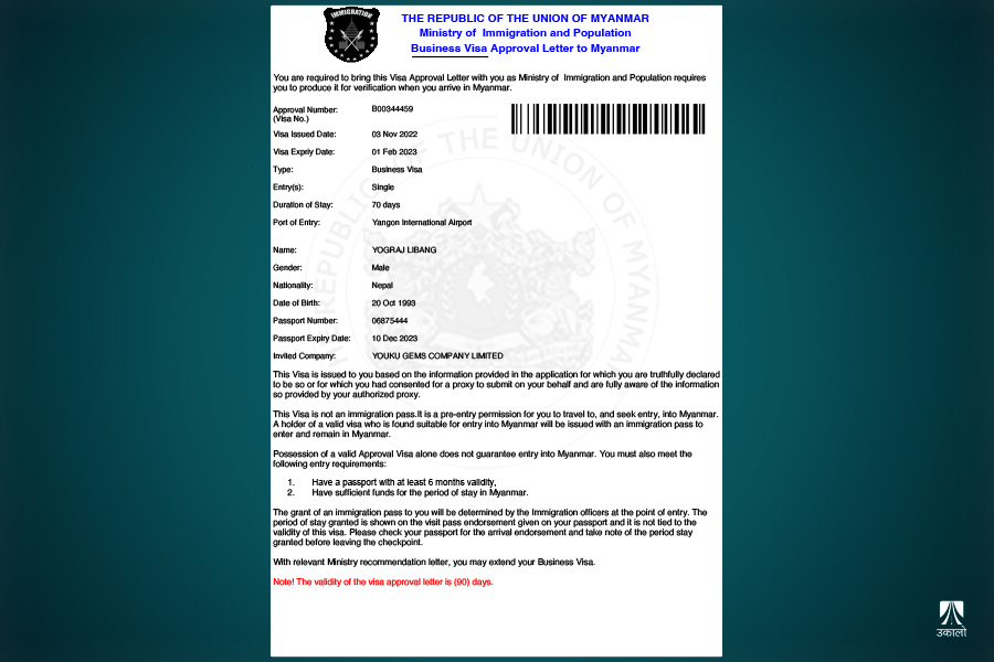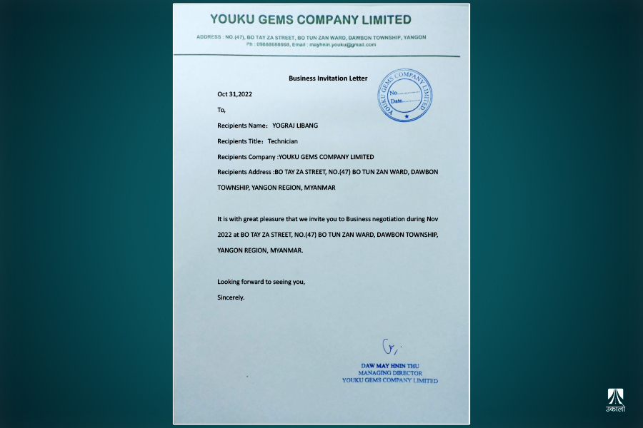 भिडियो अन्तर्वार्ता लगत्तै रंगुनस्थित योकु जेम्स कम्पनी लिमिटेडले काम दिने बताएर योगराजको लागि आवश्यक हवाई टिकट, बिमा र बस्ने होटेलको पनि व्यवस्था भइसकेको जानकारी गरायो। र, अक्टोबर पहिलो साता रुचनमार्फत अनलाइन सम्पर्कमा रहेका ती भारतीय नागरिकले भिसाको लागि पासपोर्ट लिएर आउन उनलाई दुबईको ‘बिजनेस बे ट्रेन स्टेसन’मा बोलाए। त्यहाँ भेटेर उनको पासपोर्ट लिएर गए। योगराजको भनाइमा ‘पासपोर्ट लिएर कार्यालयमै आउँछु’ भन्दा ती भारतीयले मानेनन्। र, पछि भिसासहितको पासपोर्ट पनि त्यही रेल स्टेसनमै बोलाएर फिर्ता दिए।